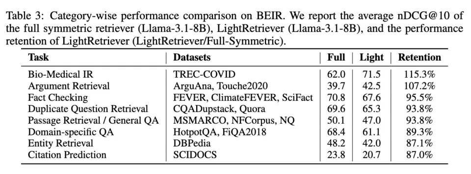 表。在 BeIR 的不同任务中,LightRetriever 的性能表现及相对变化(Retention)。