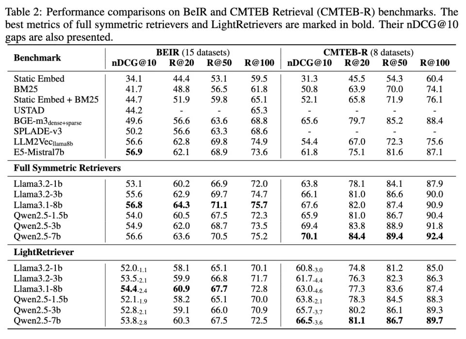 表. BeIR / CMTEB-Retrieval 主实验结果,包含经典 Embedding Model Baseline、对称式 Full LLM Retriever 与 LightRetriever 的检索效果。