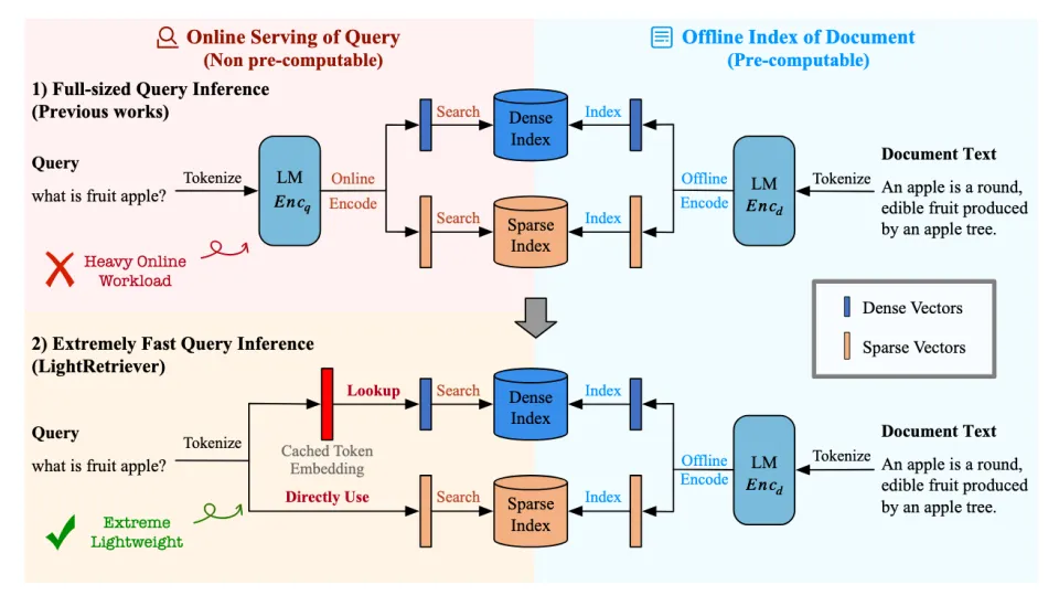 图。在稠密 / 稀疏检索中,对称式 LLM Embedding Model 使用了 1) 标准的 Full-sized Query Inference,查询侧推理负担很重;2) LightRetriever 大幅降低了查询推理成本,查询侧负载降低至不超过一层 Embedding Layer Lookup。