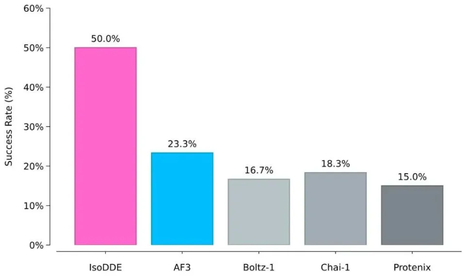 图 | 来自 Runs N' Poses 基准测试的最难泛化类别中的蛋白质-配体结构预测准确率(来源:Isomorphic Labs)