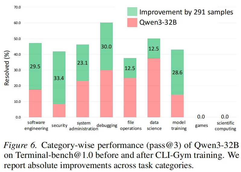 基于 CLI-Gym 生成的数据对 Qwen3 系列模型进行微调后,得到 LiberCoder 系列模型,在 Terminal-Bench 上取得显著性能提升。LiberCoder-32B 在 Terminal-Bench 1.0 上的 Pass@1 达到 38.9%,相比基础模型实现大幅提升,而规模更大的 LiberCoder-235B-A22B 达到 46.1%,超过大多数开源模型,并接近部分闭源模型性能。进一步分析发现,微调后的模型在环境问题处理能力上发生明显变化,模型不再频繁失败于编辑错误或问题定位,而更多受到上下文长度与执行时间等外部因素限制,说明其核心环境修复能力已经显著增强。同时在多个任务类别中均观察到一致提升,包括软件工程、系统管理、安全修复与调试任务,说明 CLI-Gym 数据并非针对单一场景优化,而是全面增强了模型在环境交互任务中的泛化能力。