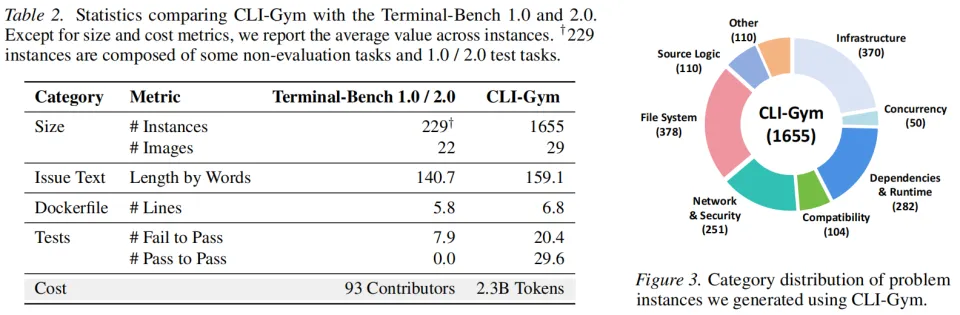 基于这一自动化 pipeline,CLI-Gym 在 29 个真实开源仓库中生成了 1,655 个环境密集型 CLI 任务实例,规模远超 Terminal-Bench 的人工构造数据,同时任务类型覆盖多个应用领域,展现出极强的可扩展性。与现有 benchmark 相比,这些任务具有更高复杂度,每个任务平均包含超过 20 个失败测试,为 agent 提供更丰富的诊断信号和修复反馈,使模型必须真正理解系统状态并执行多步操作才能完成修复,而不是通过简单代码修改或投机策略通过测试。此外,该流程完全自动化运行,仅消耗计算资源而无需人工标注,相比依赖大量工程师构造任务的传统方式大幅降低成本,使环境任务数据能够持续扩展。