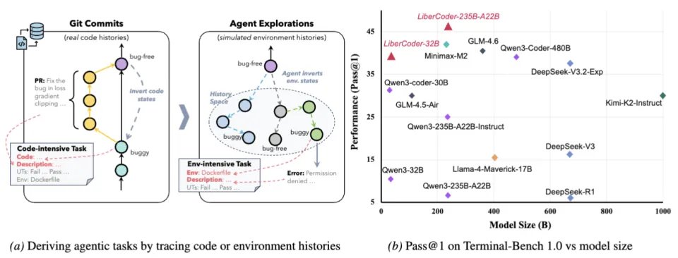 因此 CLI-Gym 来了!我们首先尝试用 Dockerfile 对环境进行结构化与可复现定义;进一步,将数据生产管线本身重新建模为一种 Agentic Coding 任务:在健康环境中驱动 Code Agent 执行环境反演(即 “劣化” 操作),自动生成问题环境及其准确的单元测试,从而实现问题实例与验证工具的自动化构造。我们在 29 个基础镜像上制造出 1655 个针对 Terminal-Bench 实例并产出 291 条高质量成功轨迹,我们的微调模型 LiberCoder 32B 和 235B 在 Terminal Bench 上分别实现了 + 28.6%(至 38.9%)和 + 21.1%(至 46.1%)的提升。
