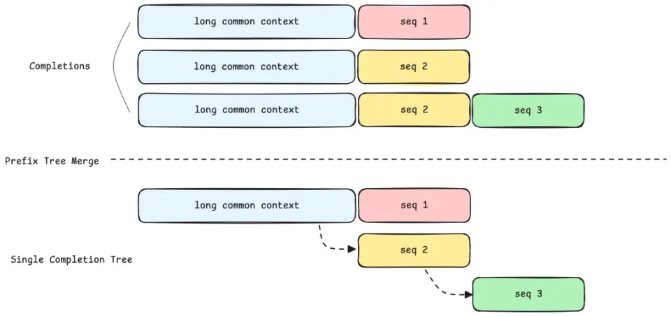 在训练效率上,Forge 引入了 Prefix Tree Merging 方案,将训练样本从线性序列重构为树形结构,消除了多轮 Agent 请求之间大量重复的上下文前缀,实现了约 40 倍的训练加速,同时显著降低了显存开销。