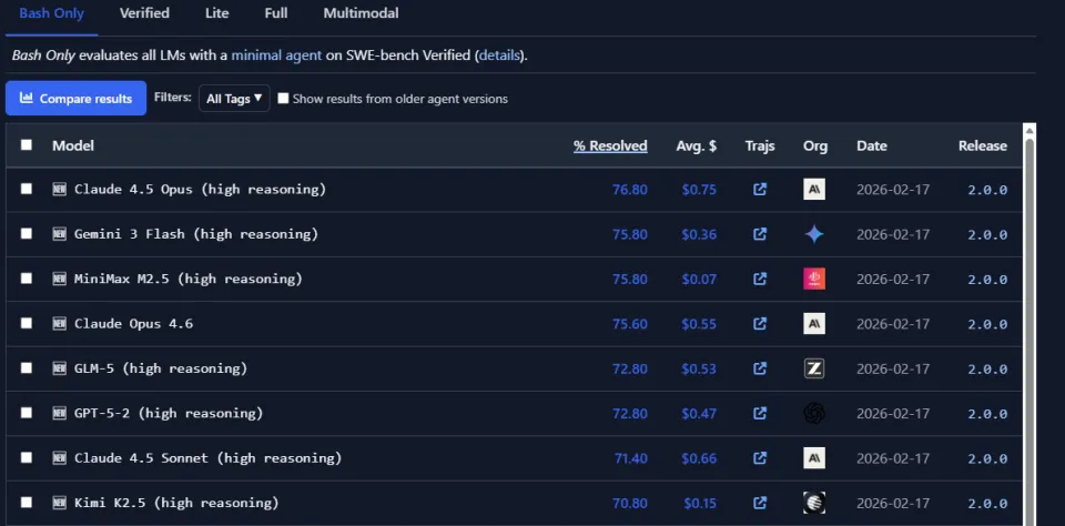 知名技术博主 Simon Willison 使用 mini-swe-agent 对当前主流模型进行了独立测评,结果显示 M2.5 排名第三,仅次于 Claude Opus 4.5 和 Gemini 3 Flash,且是开源模型中的第一名。