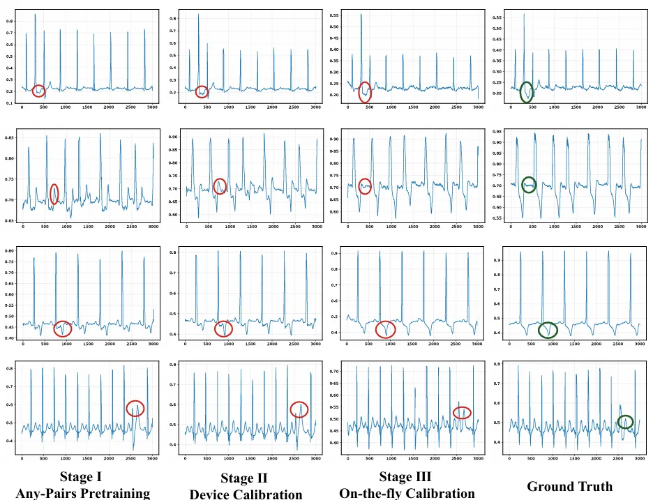 针对临床应用中的难点提出三阶段训练&部署:首先通过 Any-pairs 预训练在多数据源上学习稳定的跨视角映射先验;随后用 Device Calibration 对齐不同采集设备域差;最后引入 On-the-fly Calibration 在推理时显式估计并校正电极贴放误差与个体解剖差异导致的视角偏移,使模型能够在每次检查中快速自适配并输出诊断级一致的虚拟导联,从而系统性解决了跨设备、跨个体两类部署瓶颈。