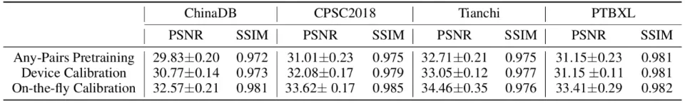 在Tianchi、ChinaDB、CPSC2018和PTB-XL四个数据集上,研究人员进一步验证了三阶段部署流程对视角合成任务的贡献:从Any-pairs预训练开始,模型先学习稳定的跨视角映射先验;随后通过Device Calibration适配不同采集设备采集信号导致的域差;最后引入On-the-fly Calibration在推理时对电极贴放误差与个体解剖差异导致的视角偏移进行快速自校准,从而显著提升真实场景下的合成质量。