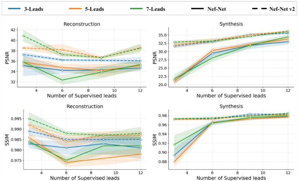在Panobench数据集上,研究人员比较了Nef-Net与NEF-NET v2在心电全景合成(ECG panoramic synthesis)任务中的性能,并系统考察了输入导联数量与监督导联数量变化对结果的影响。