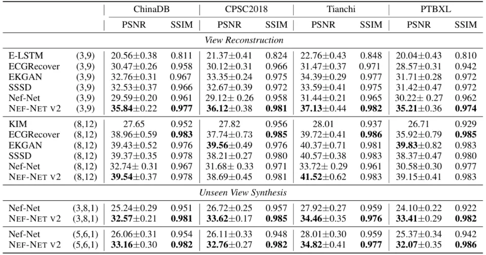 在Tianchi、ChinaDB、CPSC2018和PTB-XL四个数据集上,研究人员分别评估了多种主流模型在重建与合成两类任务中的表现。在合成任务中,括号内依次给出了输入视角数、用于重建监督的视角数以及最终用于合成生成的视角数。最佳结果以粗体标出。