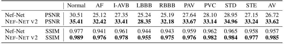 定量结果显示,NEF-NET v2在所有病理类别上均取得更高的重建保真度:平均PSNR提升6.9dB,SSIM亦保持一致增益;其中在房颤(AF)信号上的 PSNR 提升达到7.3dB。