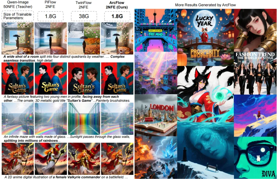 这一设计让 ArcFlow 能够显式地构建非线性轨迹。在 2-4 步的极少步数下,这种非线性轨迹比生硬的直线能更精确地贴合教师模型的原始路径。