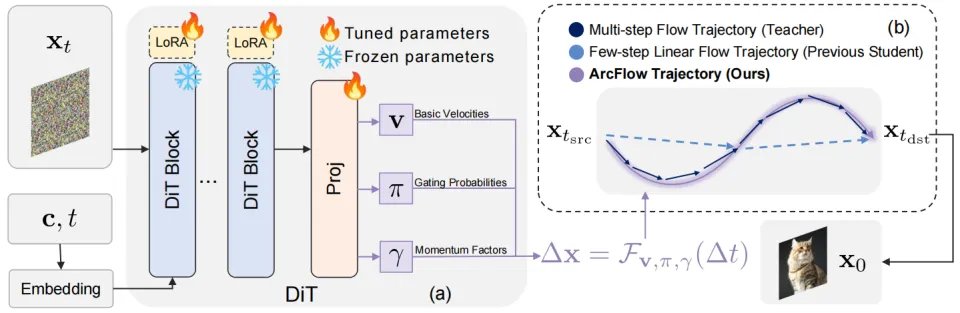 因此,ArcFlow 不需要破坏教师模型原本的参数。实验证明,仅需通过 LoRA 微调不到 5% 的参数(主要是为了适应新的动量预测头),就能实现完美的轨迹对齐。