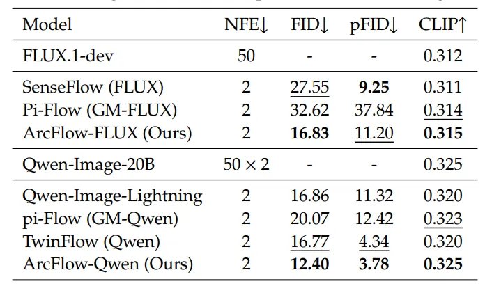 团队在 Qwen-Image-20B 和 FLUX.1-dev 这两个目前最强的开源模型上进行了验证。结果表明,ArcFlow 在速度、质量和效率上实现了的平衡。