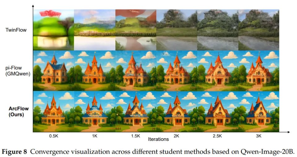 训练收敛极快:相比 TwinFlow 等全量微调方法,ArcFlow 的收敛速度快了超过 4 倍。