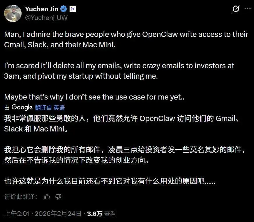 有网友表示,是个智能体就必须在沙盒里运行,任何破坏性操作,例如删除,都需要系统级的强制确认。作为一个安全总监,你有点过于自信了。