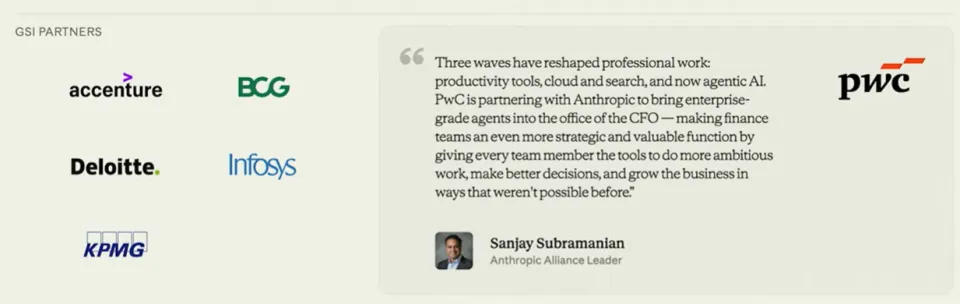 Anthropic把这套能力定义为“企业Agent”。和市场上其他Agent叙事的区别在于,不追求通用的自主行动,主要强调在企业自身的标准、合规要求和工作方式内交付成果。普华永道与Anthropic合作负责人这样评价:“过去二十年,专业工作经历了三次重要变革:生产力工具普及、云端与搜索技术发展,以及当下的智能体AI。我们与Anthropic的合作,是将这一能力引入CFO办公室,让财务团队每位成员都能承担以往仅资深分析师可完成的工作。”