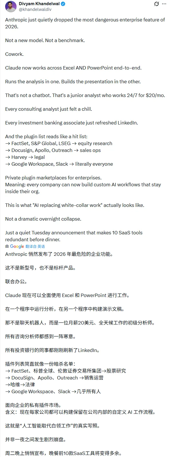 不过,X用户迪夫亚姆·坎德尔瓦尔(Divyam Khandelwal)发出警示,称这是“2026年最危险的企业功能”,Claude成为全天候初级分析师,插件列表如同“暗杀名单”指向FactSet、DocuSign、Harvey等工具,私有插件市场意味着SaaS工具可能变得多余,这正是“AI取代白领工作”的真实写照。