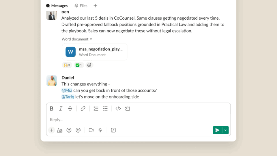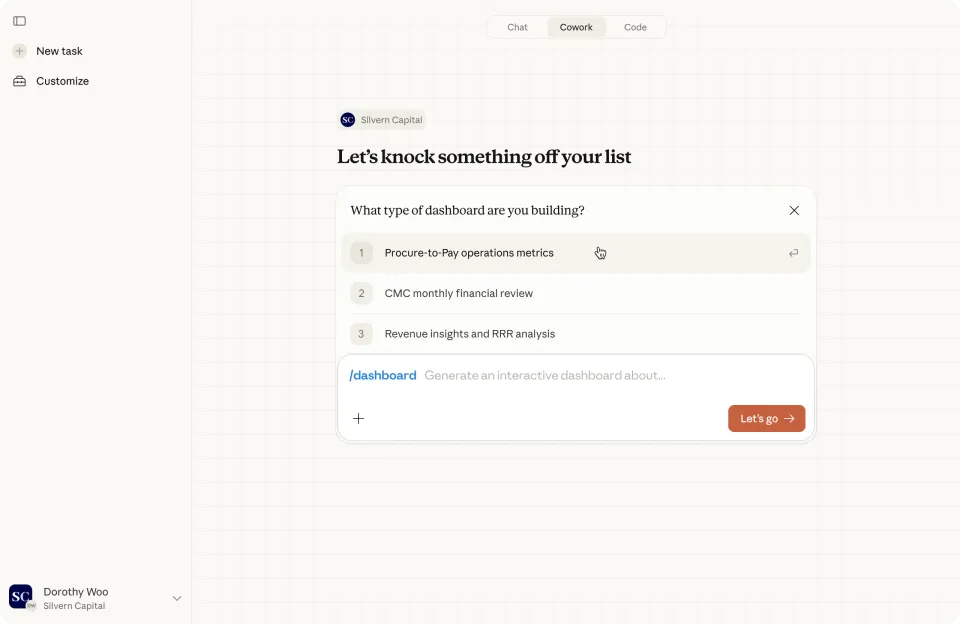 发布会里用一个虚构的金融公司Silver & Capital串起了完整场景:财务团队用Cowork分析竞争数据、生成Excel报表;Claude在PowerPoint里转化为可汇报的Deck;法务通过Thomson Reuters的Counsel Agent审查合同;销售基于所有输出快速制定对策。从分析到决策到执行,Claude作为底层智能层串联了整条链路。
