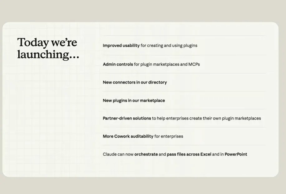 这次发布的产品清单很长:Cowork全面升级为企业级平台,推出私有插件市场和管理员管控体系,上线十余个覆盖金融、法务、HR、设计等职能的预制插件,新增Google Workspace、DocuSign、FactSet、Harvey等一批MCP连接器,Claude打通了Excel与PowerPoint的跨应用协同,还开放了OpenTelemetry审计追踪。