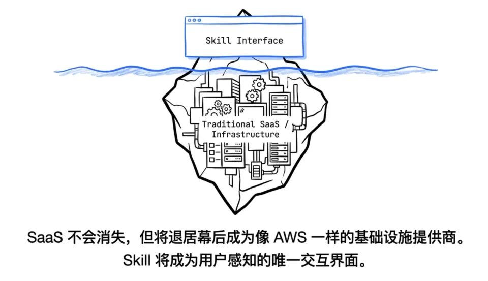 就像 AWS 不会消失,但用户不会直接操作 AWS 控制台,而是通过 Skill 间接调用它的计算资源。