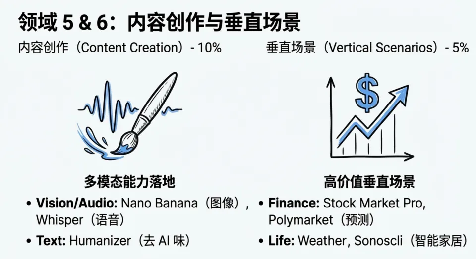 视觉(Nano Banana、Krea API)、听觉(ElevenLabs、Whisper)、文字(SEO Content Writer、Humanizer)全覆盖。