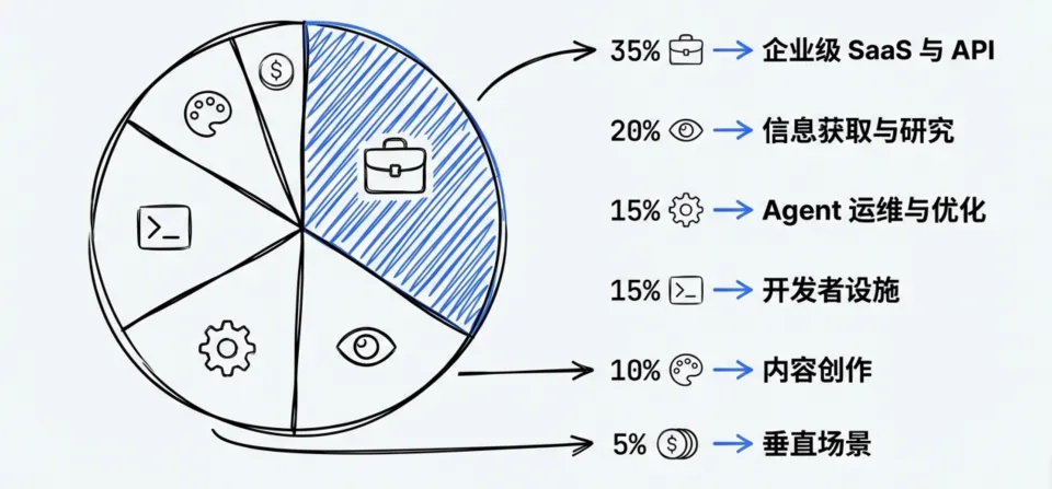 用 API 打通信息流(35%),用研究解析工具获取高质量输入(20%),用开发者设施落地代码(15%),用运维优化工具持续进化(15%),用多媒体工具生产内容(10%),最后用垂直场景 Skill 服务具体需求(5%)。
