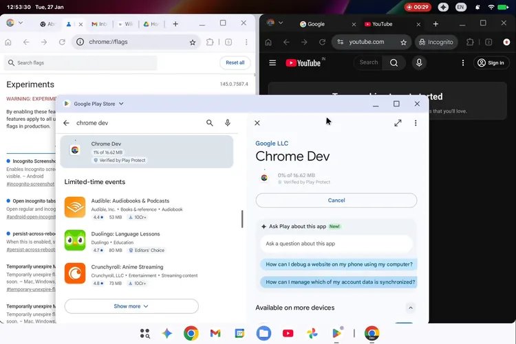 以前的 ChromeOS,本质上是一个极其轻量级的 Linux 发行版,它的核心是一个巨大的 Chrome 浏览器。为了弥补应用生态的匮乏,Google 在里面塞入了一个 Android 容器(ARCVM)来跑 Android 应用。这种“套壳”方案的体验极其撕裂:不仅占用额外的系统资源,且 Android 应用在桌面窗口下的交互、快捷键支持和生命周期管理都如同灾难。