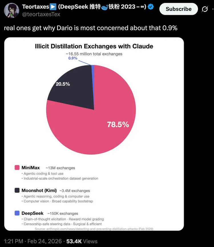 一篇通篇强调国家安全、出口管制、中国威胁的技术报告,恰好在CEO被五角大楼召见的前一天发出,恰好在2亿美元国防合同悬而未决之际发出,恰好在五角大楼威胁要将自己列为“供应链风险”的一周之后发出,恰好在竞争对手xAI刚刚向五角大楼“表忠”的同一天发出。如果这是一次纯粹的技术披露,为什么不在检测到蒸馏行为时就公布?为什么要等到与五角大楼的关系降至冰点的这一刻?