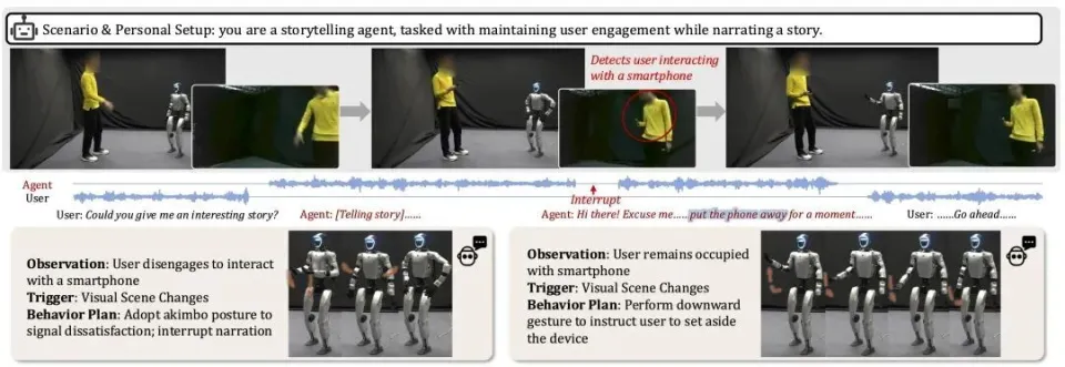 图4. 在讲故事场景中,ProAct 检测到用户玩手机分心,主动中断故事并提醒用户。