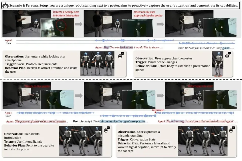 研究者们将ProAct全栈部署在Unitree G1人形机器人上,实验设计了包括「海报讲解」、「讲故事」、「寻找物品」等多个交互场景。