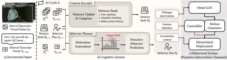图2. 认知系统架构。(a) 增量式多模态输入;(b) 上下文编码器与行为规划器并行工作;(c) 通过不同通道注入行为计划。