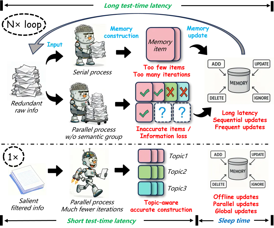 目标:把昂贵的记忆更新从在线推理中 “拿出来”,在离线并行地做去重、合并、修复与巩固。