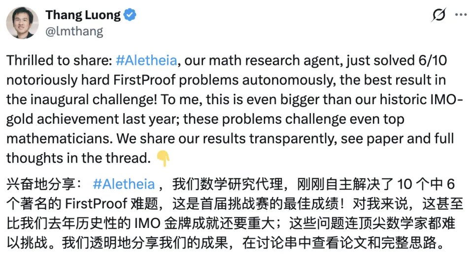 曾带队实现 AI IMO 金牌成绩的 DeepMind 超人类推理方向负责人 Thang Luong 表示,这一成果的分量超过去年 AI 在 IMO 测试中获得金牌的表现。