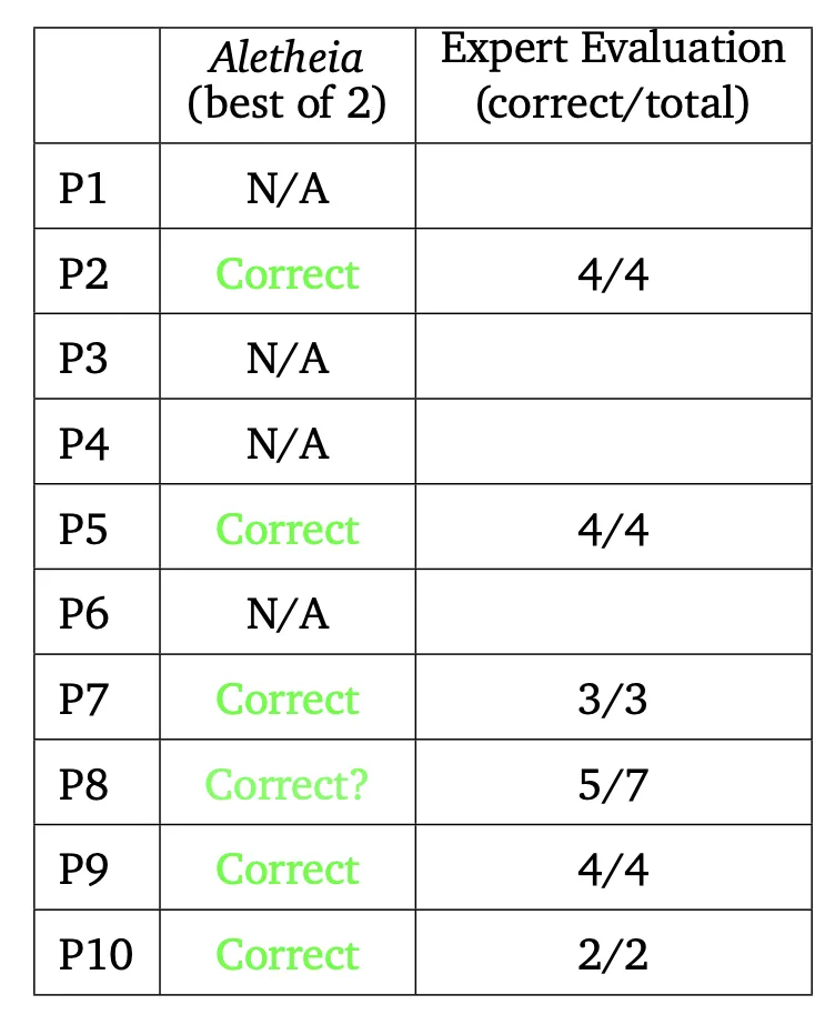 Aletheia 在 FirstProof 上的性能总结。专家评估列显示了在咨询的总专家人数中,有多少专家将解决方案评为正确。仅在 P8 上的评估不是一致的。