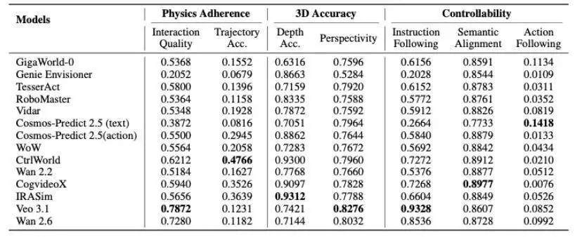 14 款世界模型物理贴合度、3D 准确性及可控性评分:
