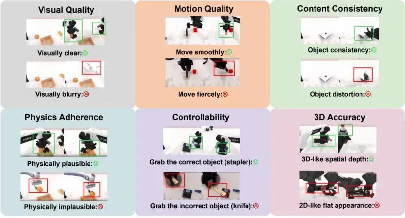 6 大核心维度涵盖视觉质量、运动质量、内容一致性、物理贴合度(Physics Adherence)、3D 准确性(3D Accuracy)、可控性,细分为 16 项量化指标,每一项都对应机器人实际应用的痛点;