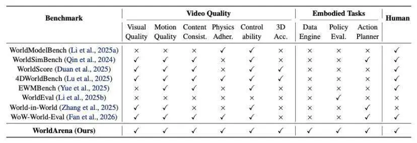 现有世界模型基准与 WorldArena 的评测维度对比: