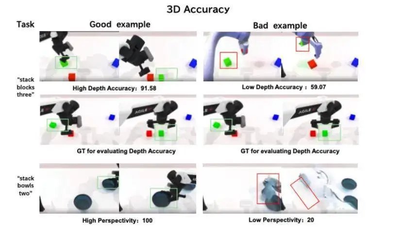 高分案例(深度准确性 91.58 ):在「stack blocks three」与 「stack bowls two」任务中,生成深度图与真实场景(GT)高度一致,物体空间位置稳定、透视关系合理,机械臂与物体保持正确的空间分离与物理接触,体现精准的三维空间结构认知;
