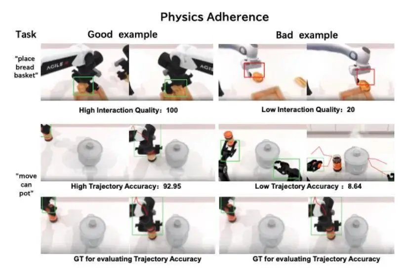 高分案例(92.95):在 「move can pot」任务中,机械臂运动轨迹(红色路径线)与真实物理轨迹(GT)高度吻合,动作精准连贯,符合物理运动规律;