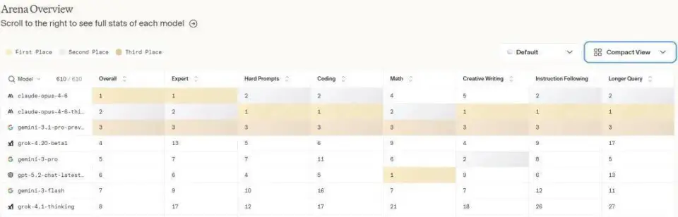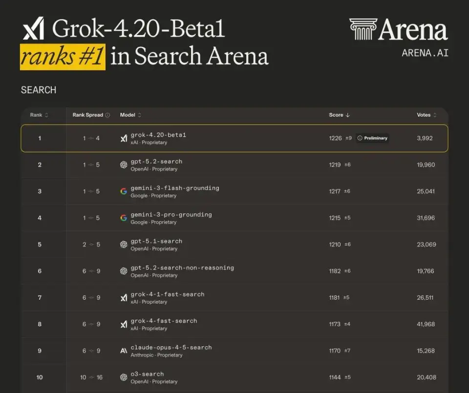 比如 Arena AI 发布了一份数据,经过 3992 位用户的评测,Grok 4.20 在评估搜索实时信息、外部知识和可靠引用的能力的 Search Arena 中目前排名第一,超过了 GPT-5.2、Gemini 3.0 Pro 等模型。
