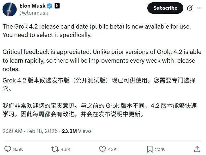 马斯克又一次跳过了所有正式流程。没有官方博客,没有技术文档,甚至连宣传推文都把自家产品的名字给拼错了。但就在这种极其「马斯克」的氛围中,Grok 4.20 Beta 版悄无声息地正式上线并进行了更新。