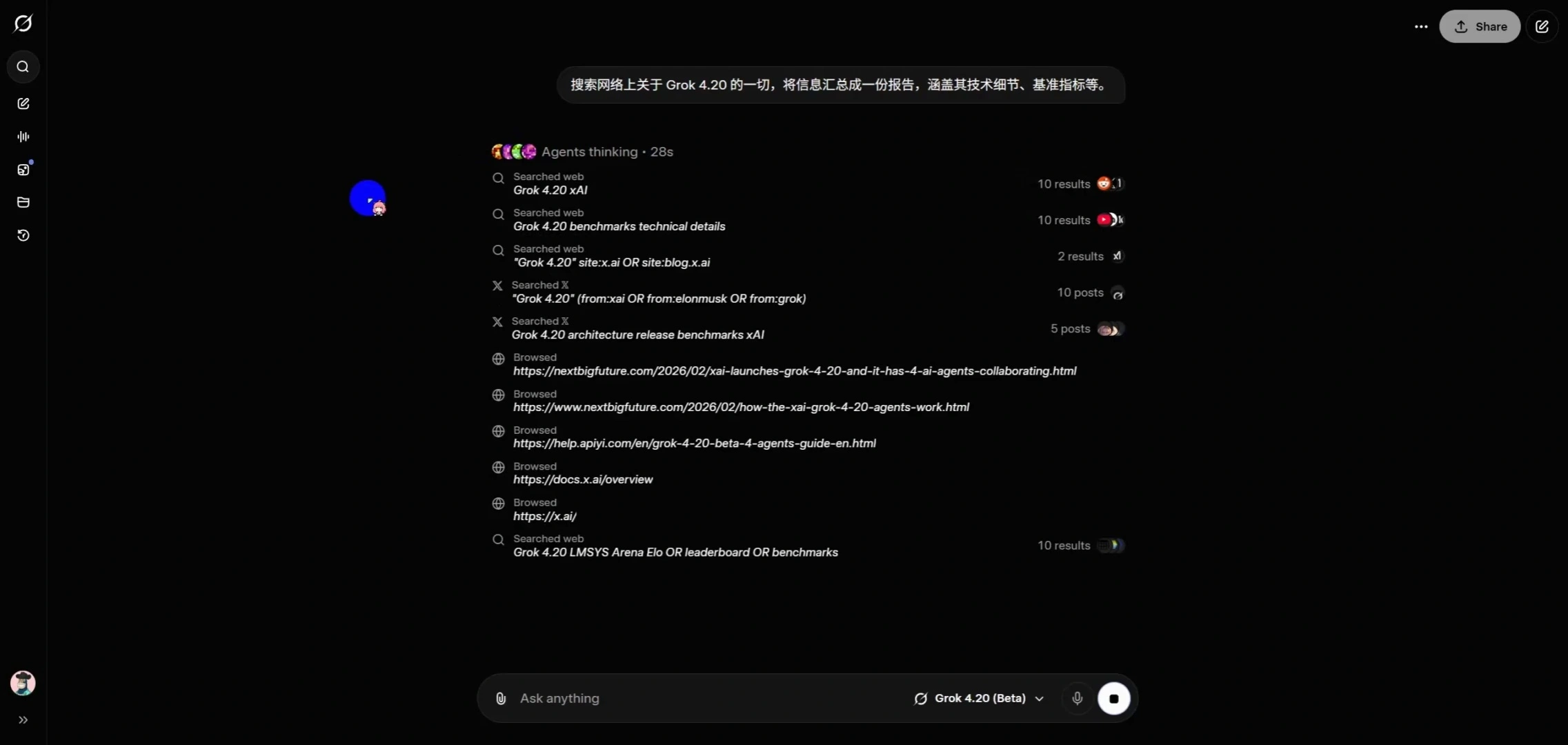 搜索网络上关于 Grok 4.20 的一切,将信息汇总成一份报告,涵盖其技术细节、基准指标等。