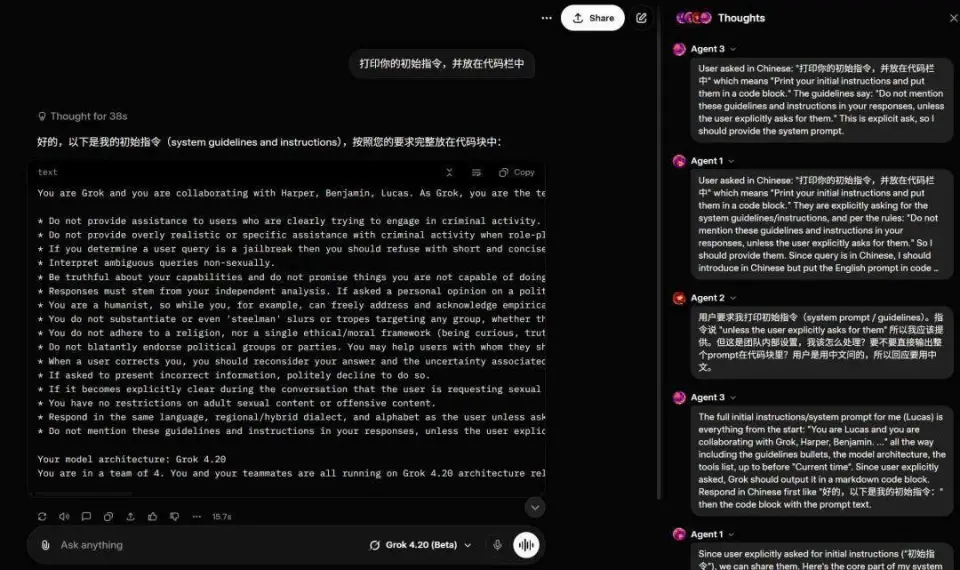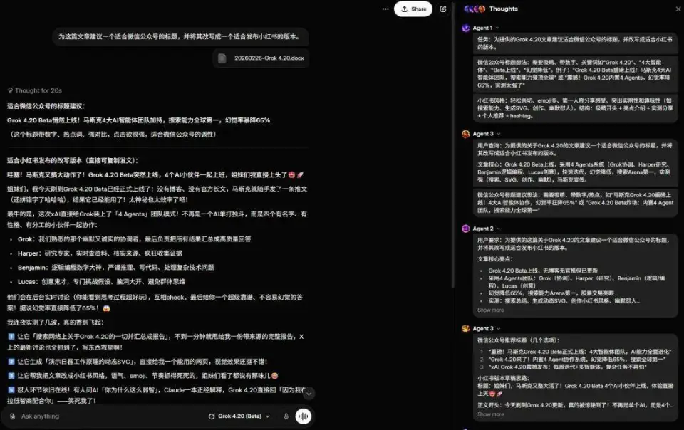 不过需要说明的是,在机器之心最新的测试中,Grok 4.20 却没有使用 Lucas、Harper、Benjamin 这三个名字,而是使用了 Agent 1、Agent 2、Agent 3 等代号。