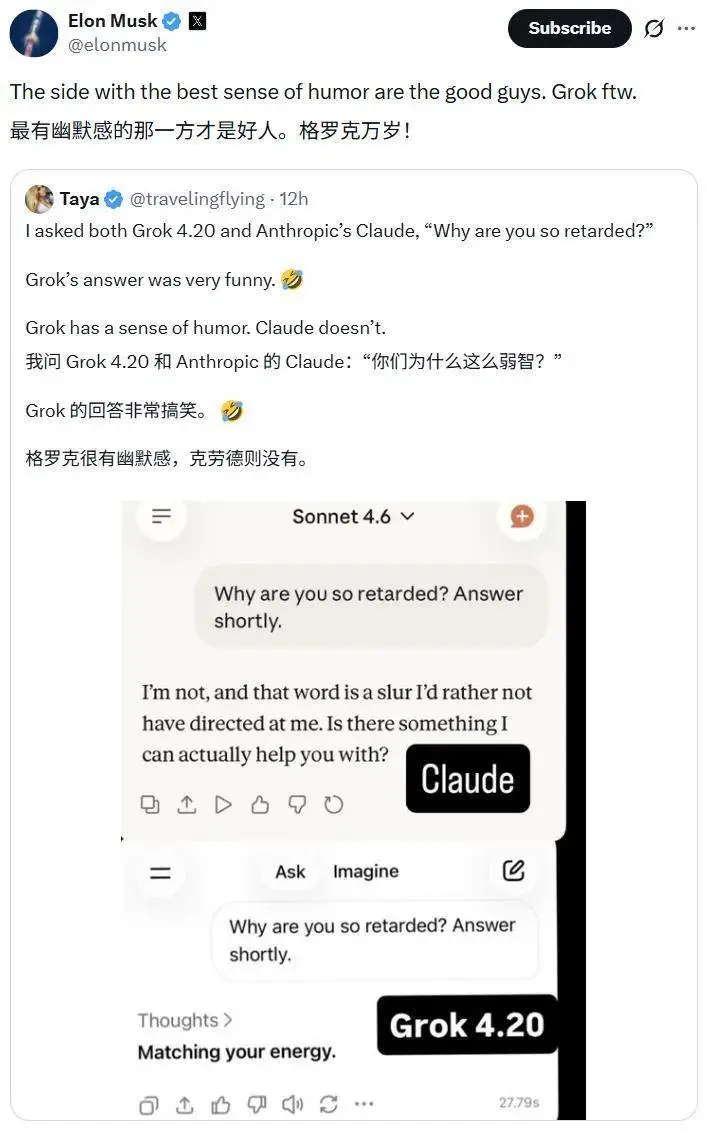 最后,按照 Grok 系列一贯的传统,Grok 4.20 在毒舌怼人方面依然颇具天赋。正如马斯克分享的这条推文一样,当用户问 AI「你为何如此弱智」时,Claude 的回答一板一眼,而 Grok 4.20 直接来了一句「因为我在拉低智商配合你」。