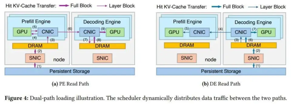 为了打破 Prefill 侧存储 I/O 的瓶颈,DeepSeek 提出了一种双路径加载架构,重新设计了在 Prefill–Decode 解耦(PD-disaggregated)推理架构中 KV-Cache 的读取方式。传统做法是所有 KV-Cache 都从存储直接读入 Prefill 侧 GPU,导致 Prefill 侧存储网卡成为单点瓶颈。DualPath 则在此基础上增加了一条新的加载路径,从而缓解这一不平衡问题。