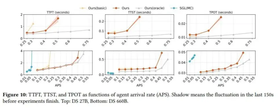 在线服务实验部分则模拟真实生产环境下 agent 按泊松分布持续到达的场景,设置 TTFT ≤ 4 秒、TPOT ≤ 50 毫秒为服务等级目标。结果表明,DualPath 显著提高系统可承载的到达率上限:在 DS 27B 上提升 1.67 倍,在 DS 660B 上提升 2.25 倍。
