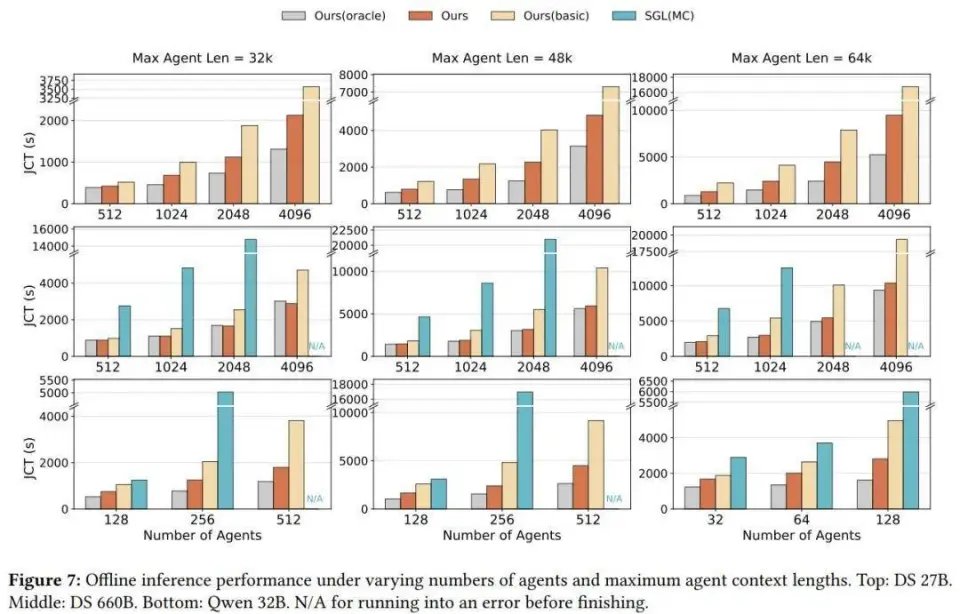 不同 Agent 批量规模与最大 Agent 长度(MAL)的影响。 随着批量规模增大以及 MAL 变长,DualPath 的优势更加明显。图 7 展示了在不同 batch size 与 MAL 组合下的 JCT 表现。SGL (MC) 出现错误,未能完成部分大规模配置(图中 token 为 N/A)。在 DS 660B 模型上,DualPath 相比 Basic 最高实现了 1.87× 的加速,并展现出接近 Oracle 的性能,这表明 KV-cache 的 I/O 开销基本被消除。在 DS 27B 上,DualPath 相比 Basic 最高提升 1.78×,但由于 1P1D 架构下存储带宽受限,其性能仍比 Oracle 慢 1.09–1.85×(见图 8)。对于 Qwen 32B,趋势与 DS 27B 类似。
