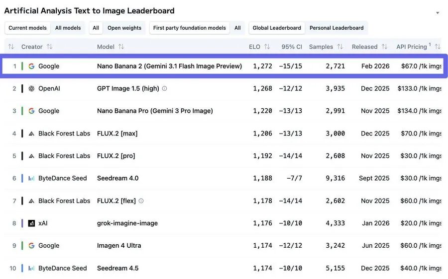 目前文生图的追逐战进入焦灼阶段,在权威图像模型测评 Artificial Analysis 榜单中,可以看到,前三名里两个被 Nano Banana 系列包揽。其中,Nano Banana 2 位列第一,图像编辑能力第三,价格却只有第二名 OpenAI 的一半,堪称“性价比之王”。