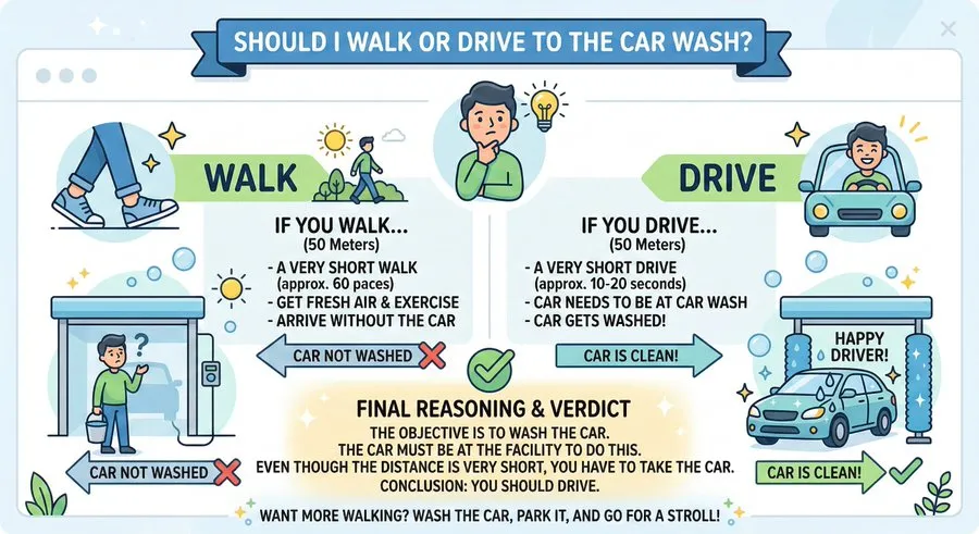 不少顶尖模型翻了车,给出“步行更环保”的答案。问题在哪?它们只分析了“50 米”,却忽略了“洗车的目标”。