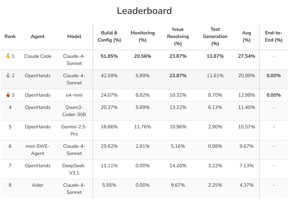 实验表明,即使是SOTA模型(如Claude-4-Sonnet),在构建与配置任务上的成功率仅为51.85%,监控任务仅为20.56%,而在全链路流水线任务中成功率更是为0%,揭示了当前AI在处理动态系统与长链路推理上的显著短板。